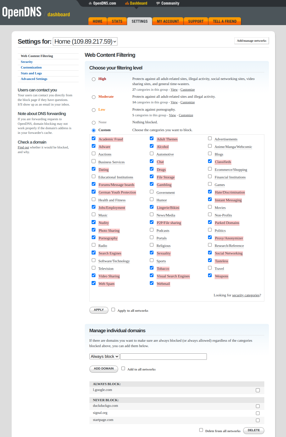 Mais pour la restriction de contenu, nous allons utiliser une combinaison de OpenDNS et de iptables/nftables pour restreindre les catégories de site internet uniquement pour les utilisateurs concernés. (Les enfants).